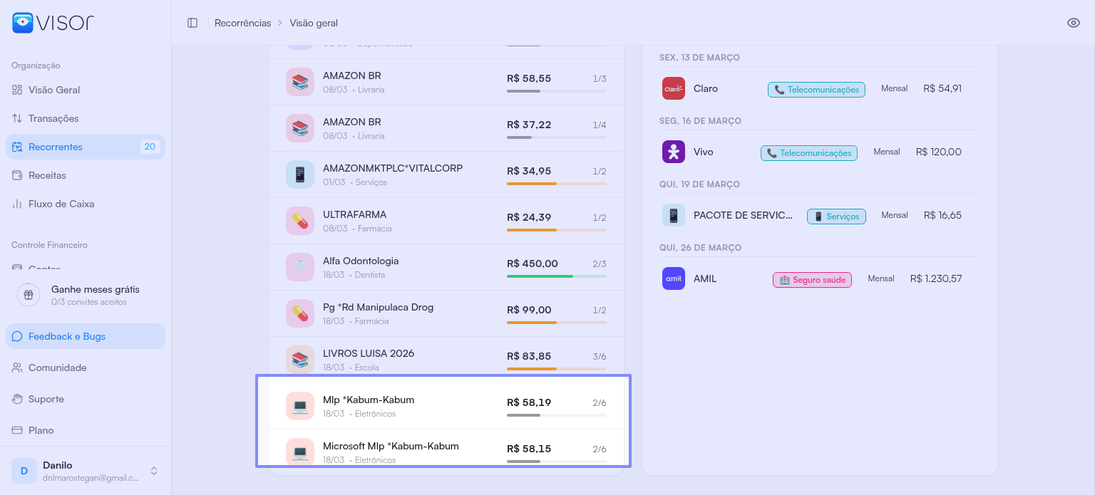 Quando existe um parcelamento com o valor da primeira parcela diferente dos demais, o sistema cria dois pagamentos recorrentes com o mesmo numero de parcela, incorrendo em erro no valor de recorrencia.