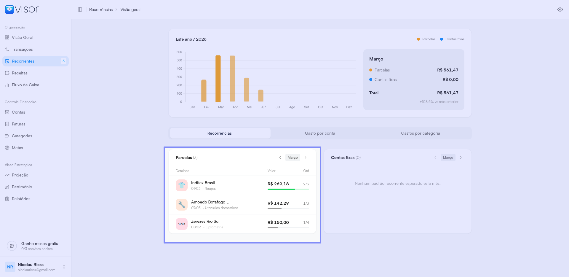 Por algum motivo o sistema “rebobina” e mostra parcelas adiantadas, que já estão pagas na vida real e que marquei como pagas aqui, como não-pagas. Acho que marquei umas 2x elas como tal e um tempo depois voltam a aparecer na contabilidade dentro da aba recorrentes. Segundo e terceiro pagamento na foto