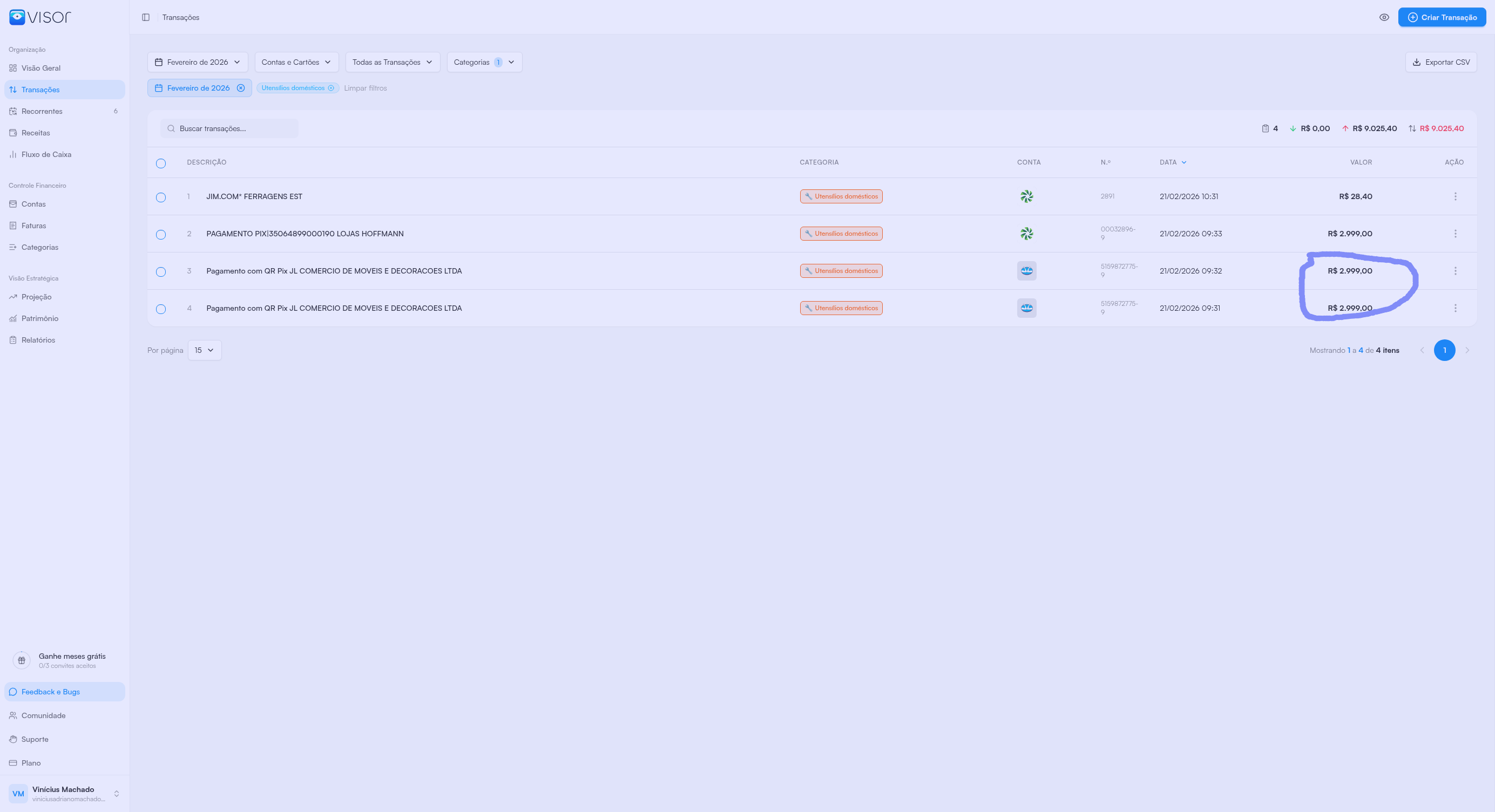 Tive 2 transações no PIX no Mercado Pago que não foram efetivadas e mostra nas transações como gastos mensais e está somando na categoria indevidamente.