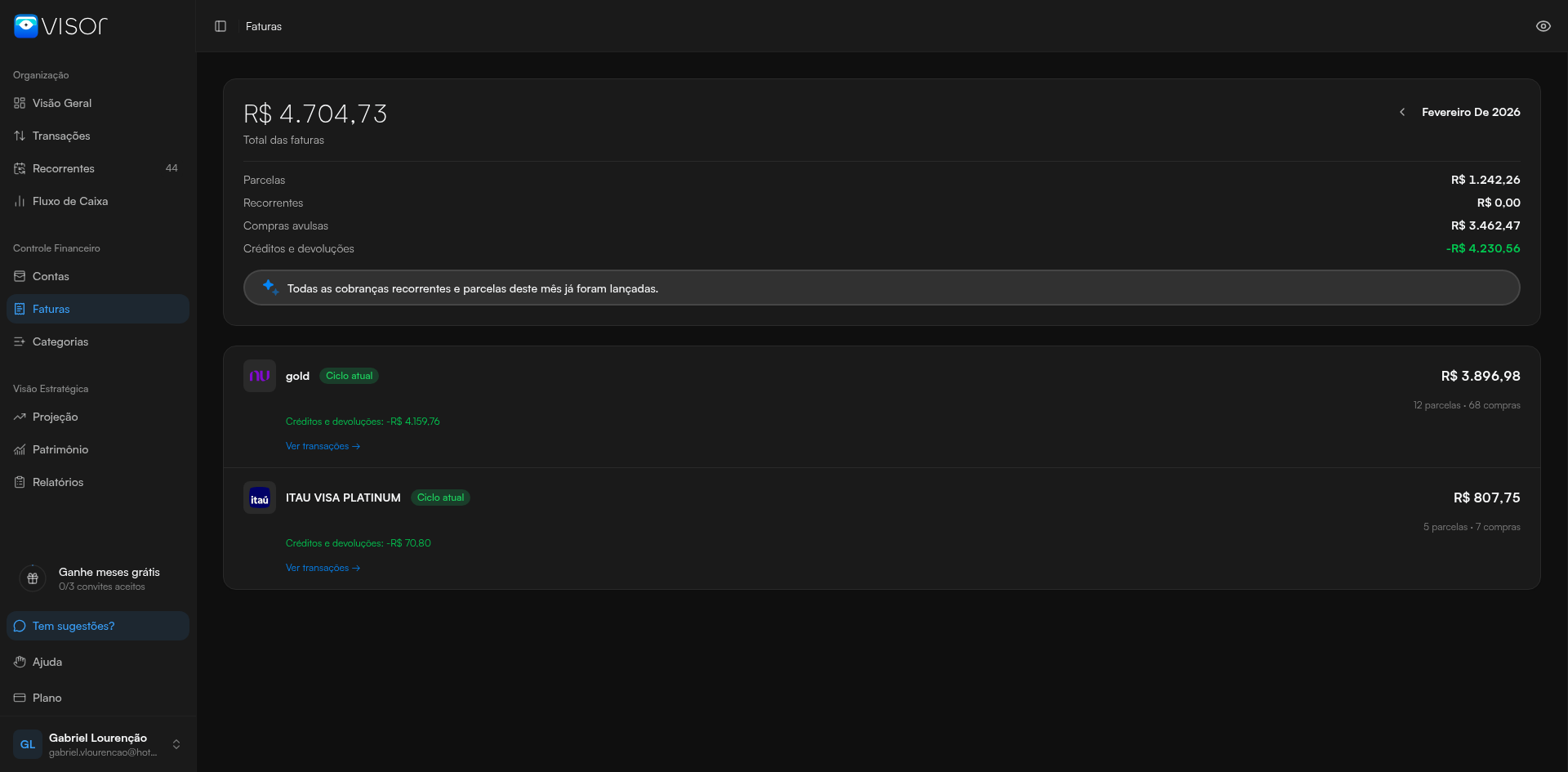 E na visualização de contas as faturas estão com valores muito altos (provavelmente somando)